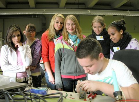 Schülerinnen der Schlossschule Gomaringen besuchten die Elektronikwerkstatt der Bildungsakademie. Azubi Philipp Besenhofer gab alles.