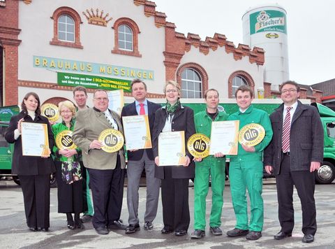Ausgezeichnete Biere aus Mössingen: Yvonne Piater, Baden-Württembergischer Brauerbund, Irmgard Fischer, Vladimir Rodau, Heinrich Fischer, Geschäftsführer und Braumeister, Hans-Walter Janitz, Andrea Fischer, Geschäftsführerin, Jörg Ruf, Braumeister und Produktionsleiter, Cesare Cani und Michael Bulander, Oberbürgermeister der Stadt Mössingen (v.l.n.r.), freuen über die DLG-Medaillen. Foto: Fischer/Meyer