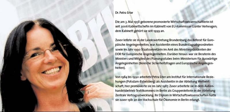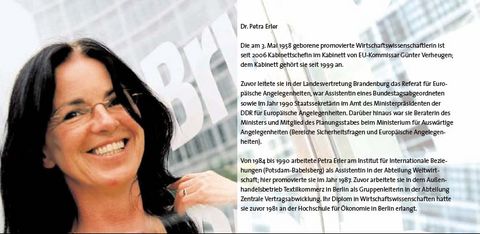 Festrednerin ist Dr. Petra Erler. Die am 3. Mai 1958 geborene promovierte Wirtschaftswissenschaftlerin ist seit 2006 Kabinettschefin im Kabinett von EU-Kommissar Günter Verheugen; dem Kabinett gehört sie seit 1999 an.