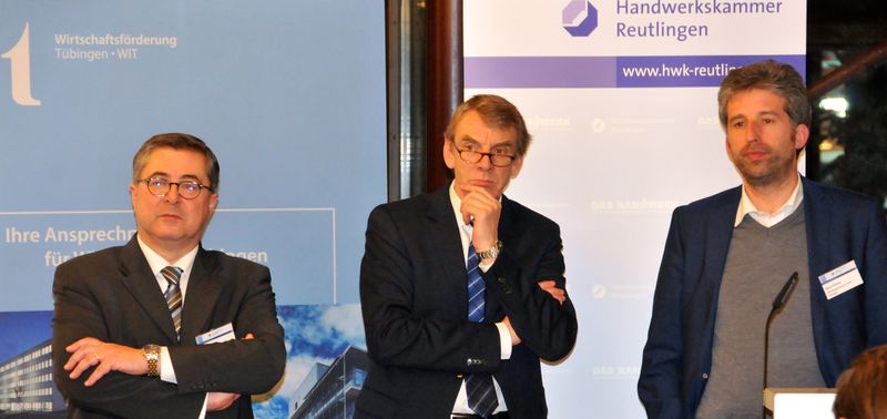 IHK-Vizepräsident Dr. Hans-Ernst Maute, Handwerkskammerpräsident Harald Herrmann und Tübingens Oberbürgermeister Boris Palmer (v.li.n.re.) stellten sich den Fragen der Gäste.