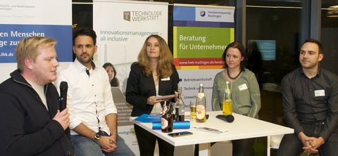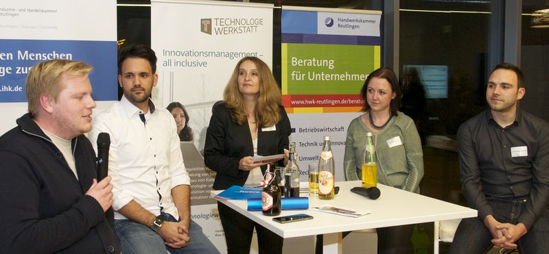 Anschließend stellten sich beim Gründertalk in der Technologiewerkstatt Albstadt vier junge Unternehmerinnen und Unternehmer aus der Region den Fragen von Sylvia Weinhold von der Handwerkskammer Reutlingen.