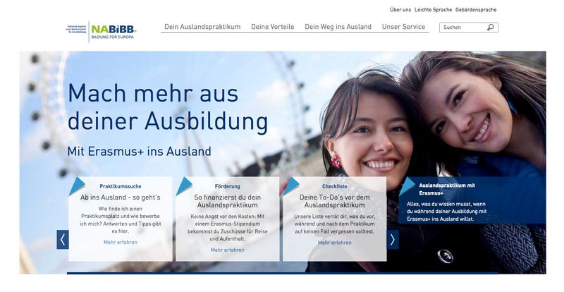 Das Webangebot der Nationalen Agentur beim Bundesinstitut für Berufsbildung beantwortet alle wichtigen Fragen von Auszubildenden und Betrieben zur Finanzierung und zur Antragstellung. Darüber werden Planungshilfen, etwa zur Suche nach einem Praktikumsplatz, zur Unterbringung oder zu den erforderlichen Sprachkenntnissen, zur Verfügung gestellt. In kurzen Videos berichten ehemalige Stipendiaten über ihre Praktika.