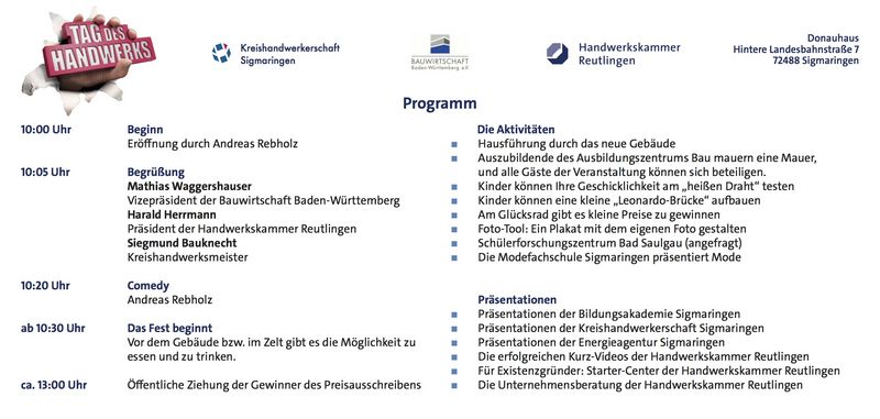 Mathias Waggershauser, Vizepräsident der Bauwirtschaft Baden-Württemberg, Harald Herrmann, Präsident der Handwerkskammer Reutlingen, und Kreishandwerksmeister Siegmund Bauknecht werden die zahlreichen Gäste begrüßen, bevor ein Fest für jung und alt mit Essen und Trinken, Musik, Spielen und unterhaltsamen Informationen beginnt.