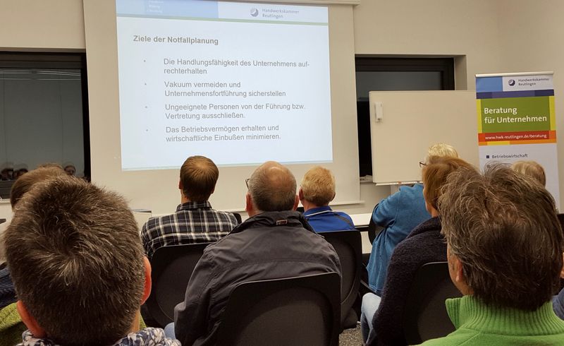 Die interessierten Teilnehmerinnen und Teinehmer informierten sich dabei, wie man sich und seinen Betrieb vorbereiten kann, wenn der Chef oder die Chefin unvorhergesehen, sei es durch Krankheit oder Tod, ausfallen.