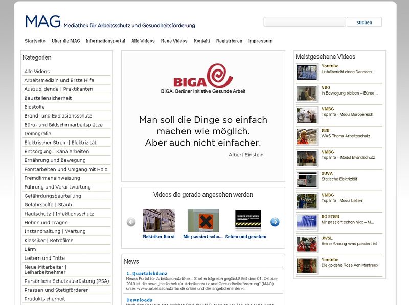 An Arbeitsschutzfilmen herrscht kein Mangel. Jedoch fehlte bislang eine Plattform, auf der die Videoclips und Kurzfilme von Berufsgenossenschaften und anderen Fachzirkeln gesammelt und systematisiert angeboten werden. Die Mediathek für Arbeitsschutz und Gesundheitsförderung will diese Lücke schließen: der internetbasierte Service erleichtert den Zugang zu Medien und dient so zur inhaltlichen, didaktischen und optischen Aufwertung betrieblicher Arbeitsschutzunterweisungen. Das Angebot deckt 35 Einzelkategorien ab. Unter anderem werden die Themen Gefahrstoffe, Schutzausrüstungen, Lärm oder Baustellensicherheit, aber auch die Gestaltung von Büroarbeitsplätzen behandelt.