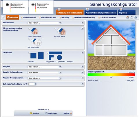 Der Sanierungskonfigurator des Bundesministeriums für Wirtschaft und Technologie und des Bundesministerium für Verkehr, Bau und Stadtentwicklung unterstützt Hauseigentümer und Mieter dabei, die energetische Qualität von Immobilien zu bewerten und zeigt in wenigen Schritten Möglichkeiten zu deren Verbesserung auf.