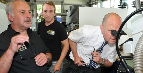 Wolfgang und Jonas Bertschinger erklären Hauptgeschäftsführer Dr. Joachim Eisert (von links nach rechts), worauf es beim Laserschweißen ankommt.