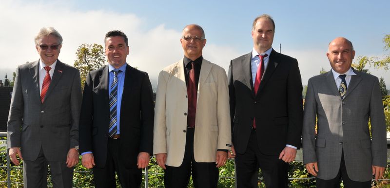 Vizepräsident August Wannenmacher, Steinmetz- und Steinbildhauermeister Paulus Roth, Metallbaumeister Marc Schramm, Metallbaumeister Thomas Laupp und der stellvertretende Hauptgeschäftsführer der Handwerkskammer Reutlingen Rainer Neth (v.l.n.r.).