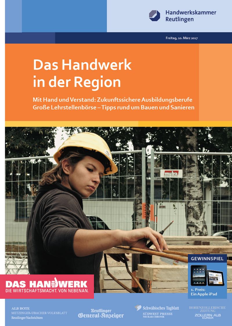 Die Handwerkskammer Reutlingen hat erneut gemeinsam mit Tageszeitungen aus der Region ein Paket geschnürt, damit Sie Ihren Betrieb in einer hochwertigen Beilage im Magazin-Format präsentieren können.