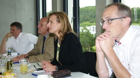 Geschäftsführer Ewald Schmauer, MdL Karl-Wilhelm Röhm, Staatssekretärin Karin Schütz und Geschäftsführer Frank Bechle (v.li.n.re.) beim Informationsgespräch über „Ausbildungsmöglichkeiten und Fachkräftesicherung“ bei F.K. Systembau.
