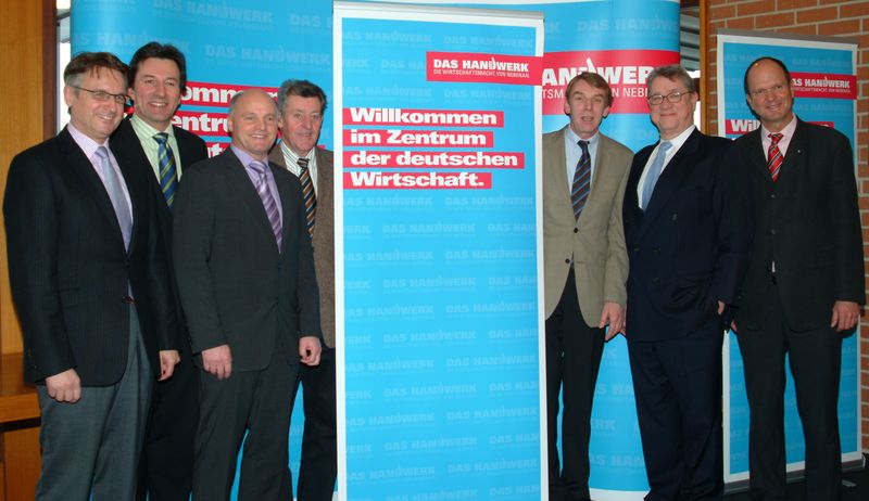 Vertreter aus allen Landkreisen des Kammerbezirks waren zur Pressekonferenz nach Reutlingen gekommen: die Kreishandwerksmeister Gebhart Höritzer (Tübingen) und Ralf Bohnet (Freudenstadt), der stellvertretende Kreishandwerksmeister Ernst Berger (Zollernalbkreis), die Kreishandwerksmeister August Dannegger (Sigmaringen) und Harald Herrmann (Reutlingen), Präsident Joachim Möhrle und Hauptgeschäftsführer Dr. Joachim Eisert (v.l.n.r.).
