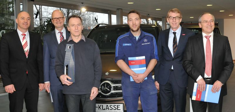 Ralf Dürr, Leiter Kundendienst bei Mercedes Benz in Pfullingen, Hauptgeschäftsführer Dr. Joachim Eisert, Ausbilder Michael Gugel mit dem Auszubildenden Tobias Spranger, Präsident Harald Herrmann und Manfred Steck, Serviceleitung (v.li.n.re.).