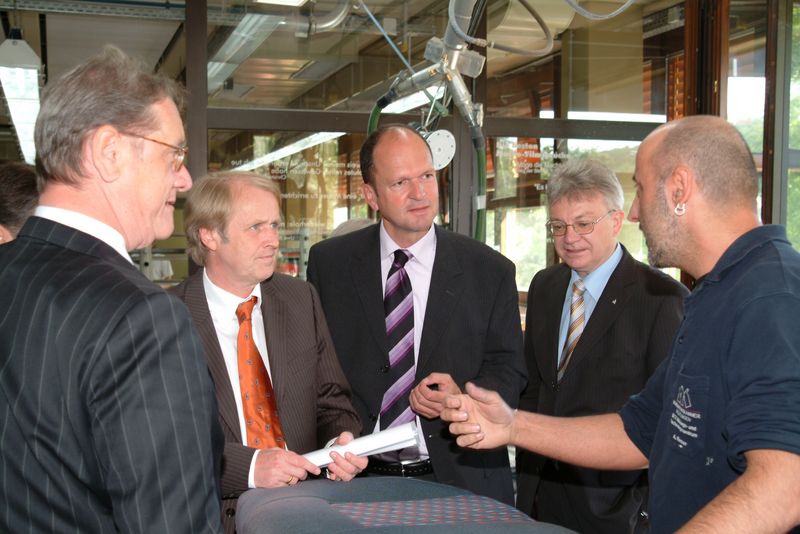 Präsident Joachim Möhrle, Dr. Werner Bruns, Leiter der Abteilung Mittelstand des Wirtschaftsministeriums Baden-Württemberg, Hauptgeschäftsführer Dr. Joachim Eisert, Vizepräsident August Wannenmacher im Gespräch mit Ausbildungsmeister Armin Renner (v.l.n.r.).