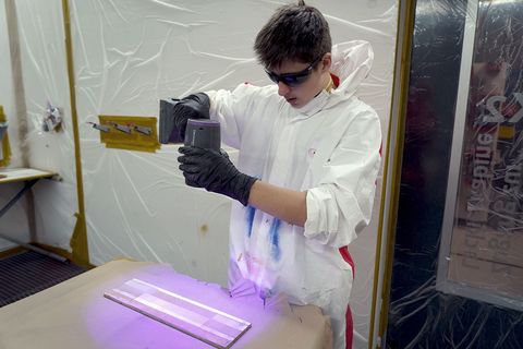 Mit einer UV-Lampe härtet ein Schüler eine lackierte Fläche.