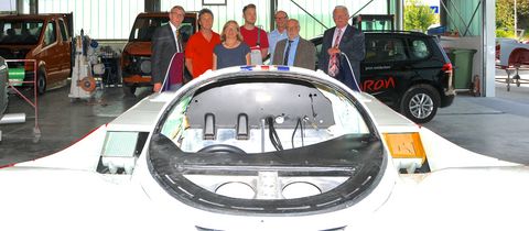 Präsident Harald Herrmann, Theo Beutinger mit Ehefrau Helga und Sohn Markus, Karl Griener, Geschäftsführer der Kreishandwerkerschaft Sigmaringen, Vorstandsmitglied Hermann Dreher und Kreishandwerksmeister Siegmund Bauknecht. Im Vordergrund ein Rennsport-Klassiker aus den 80er-Jahren, der bald wieder in der originalgetreuen Lackierung zu bestaunen sein wird.