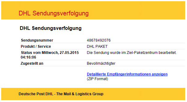 Wenn Sie unsicher sind, ob eine E-Mail echt ist, empfehlen wir Ihnen, den Link in der E-Mail nicht anzuklicken, sondern die enthaltene Sendungsnummer manuell auf der Internetseite www.dhl.de in die Suchmaske zur Sendungsverfolgung einzugeben.