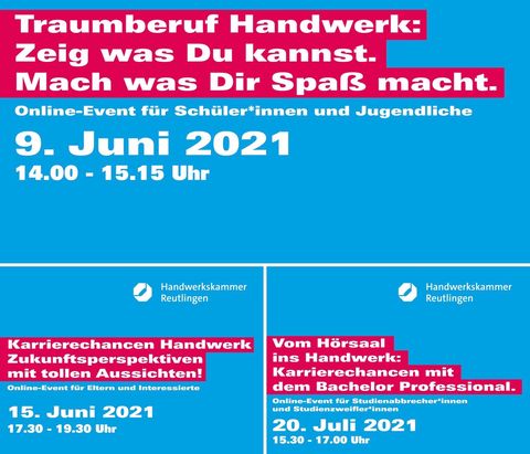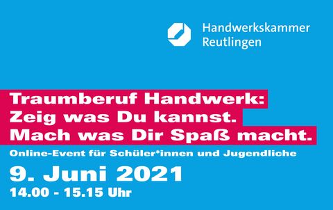 Die Monate Juni und Juli 2021 stehen in der Handwerkskammer ganz im Zeichen der Ausbildung. Alles was Schülerinnen und Schüler, Jugendliche, Eltern oder Studienabbrecherinnen und -abbrecher interessiert, wird in kurzweiligen und interessanten Online-Events von unseren Expertinnen und Experten erläutert.