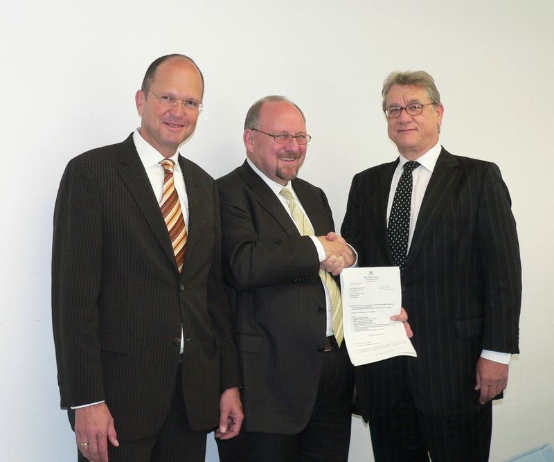 Staatssekretär Richard Drautz (Mitte) überreichte Präsident Joachim Möhrle (rechts) und Hauptgeschäftsführer Dr. Joachim Eisert (links) die Bewilligungsbescheide für die Bildungsakademie Tübingen.