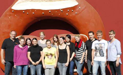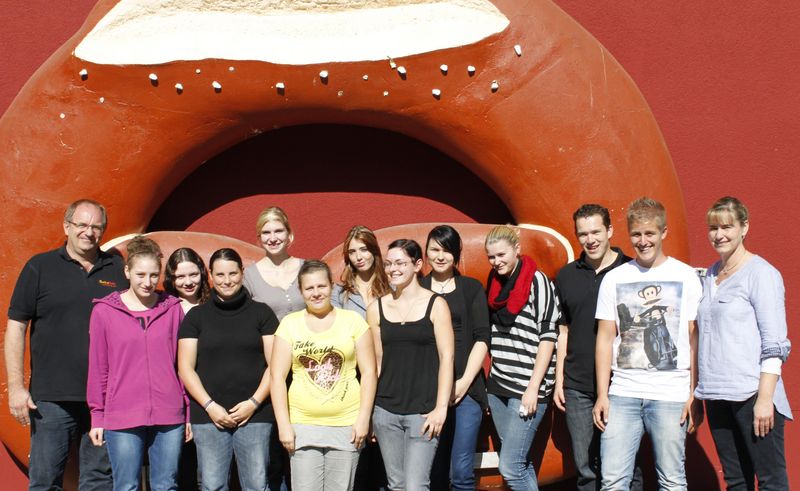 Im Schatten der Brezel: Heiner Beck (links), Anita Beck (fünfte von links) und Jochen Eggert (dritter von rechts) sowie die neuen Auszubildenden vom BeckaBeck.