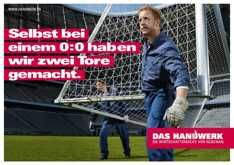 Auch bei den neuen Plakat- und Anzeigenmotiven setzt die Imagekampagne des Handwerks wieder auf ein Augenzwinkern: "Selbst bei einem 0:0 haben wir zwei Tore gemacht."
