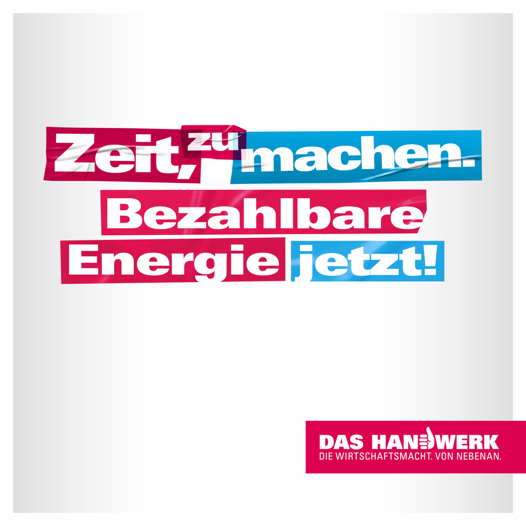 Zur Verfügung stehen verschiedene Motive, mit denen die Forderungen des Handwerks nach bezahlbarer Energie, weniger Bürokratie und mehr Wertschätzung auf Internetseiten, über Social-Media-Kanäle oder als Plakat transportiert werden können.