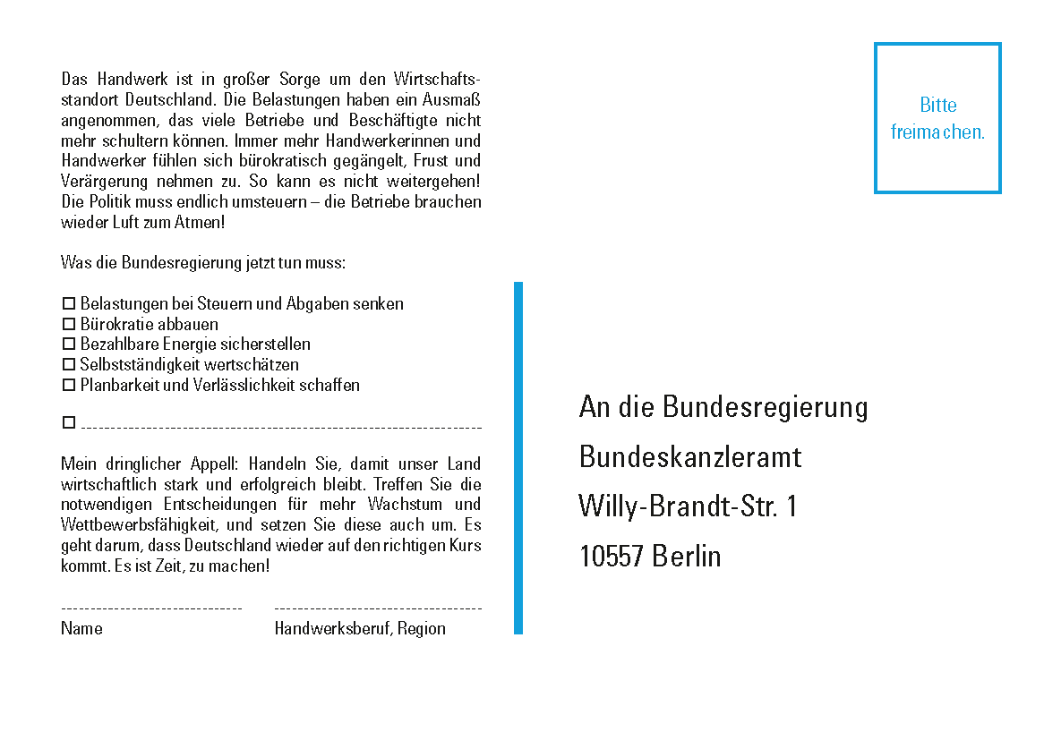 Gleichzeitig läuft eine bundesweite Postkartenaktion an, die diese Anliegen des Handwerks nach Berlin tragen sollen. Die an die Bundesregierung adressierten Karten erreichen Sie auf mehreren Wegen: ein Exemplar ist der Deutschen Handwerks Zeitung beigelegt. Zusätzlich sind die Karten bei der Handwerkskammer und über die Kreishandwerkerschaften abrufbar.